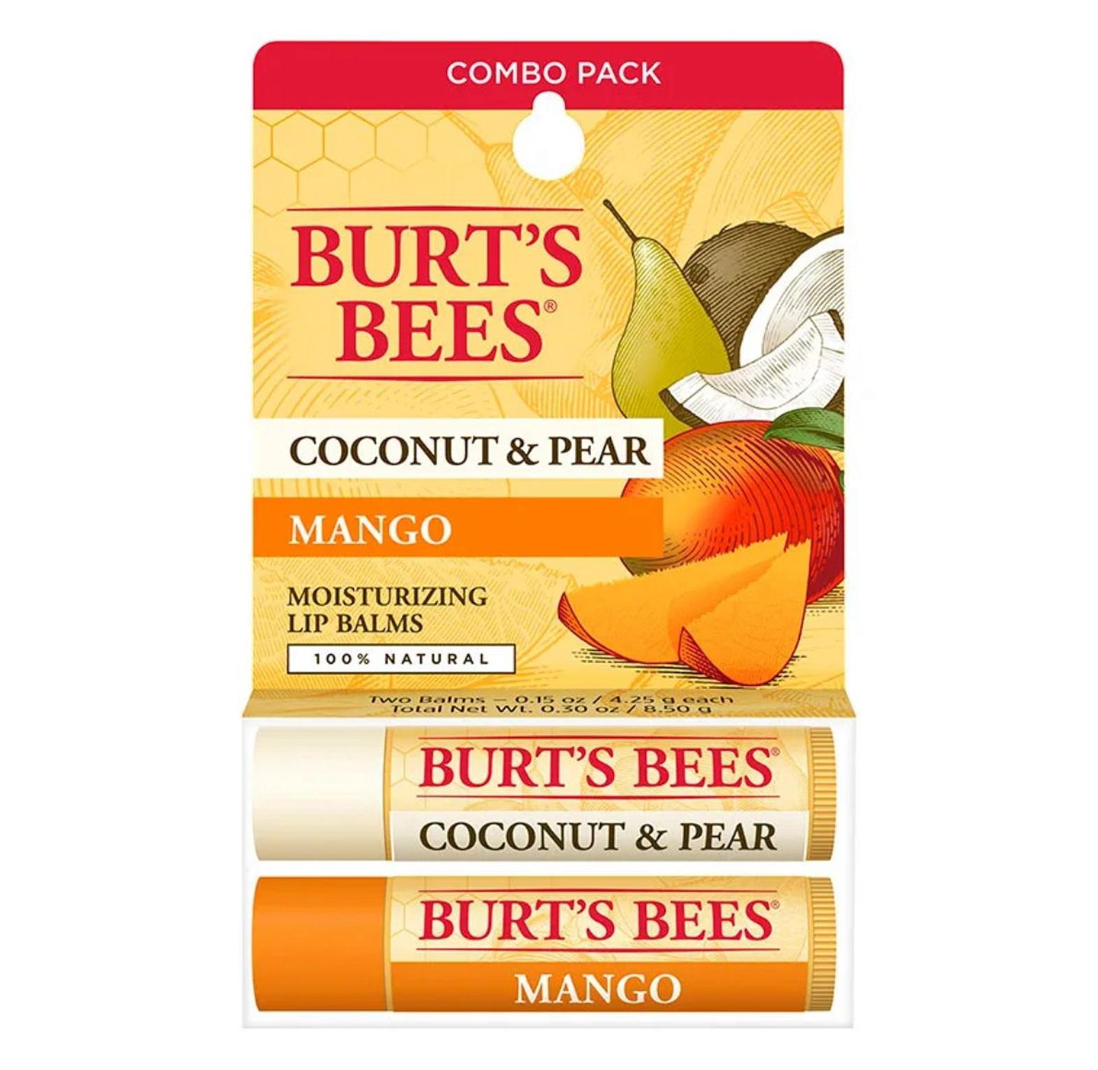 Burt’s Bees Lip Balm Coconut Pear and Mango Two Pack hydrates and nourishes your lips with tropical fruit flavors and all-natural ingredients.