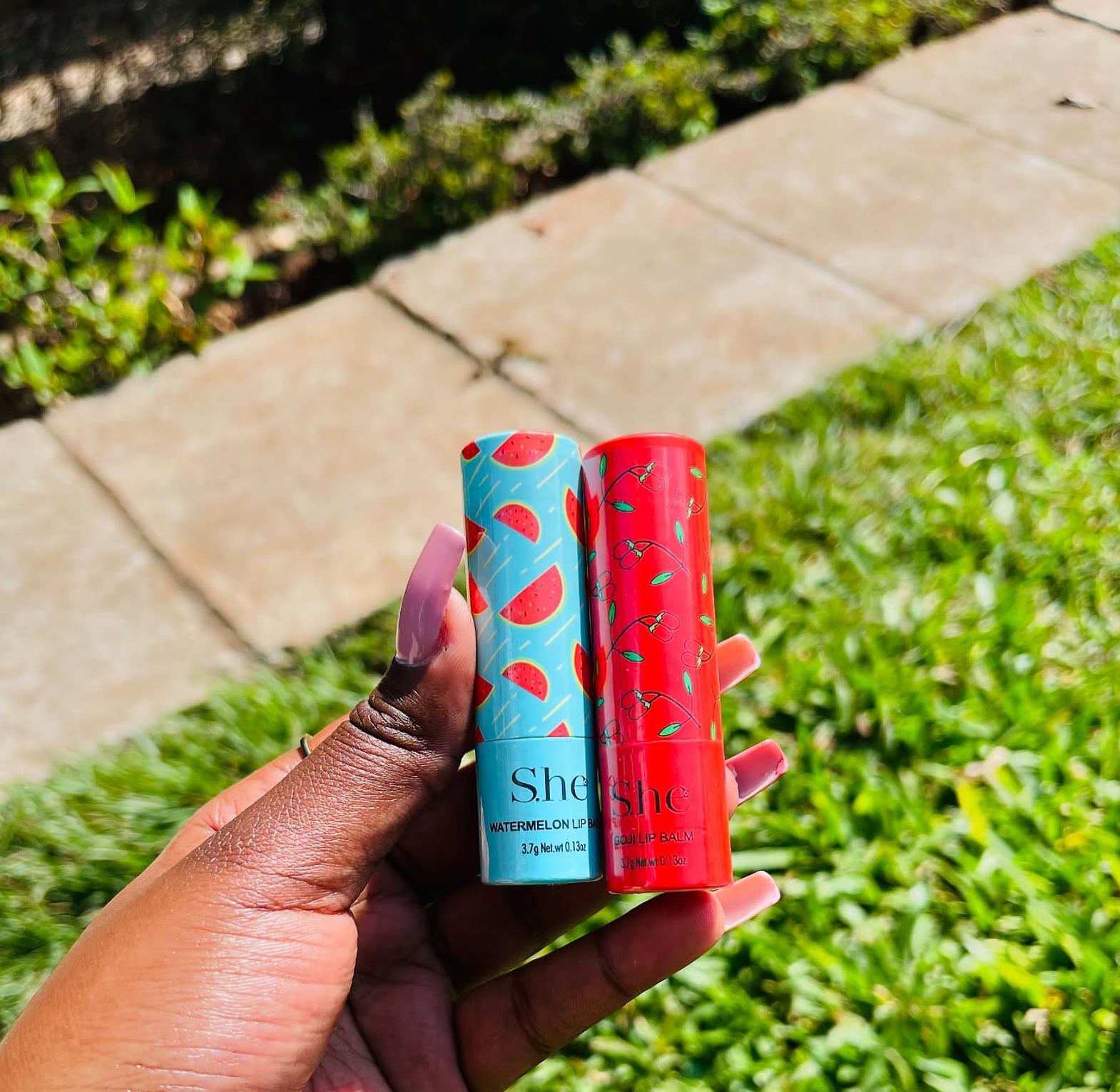 A moisturizing lip balm enriched with Vitamin E, available in delightful Goji and Watermelon flavors.